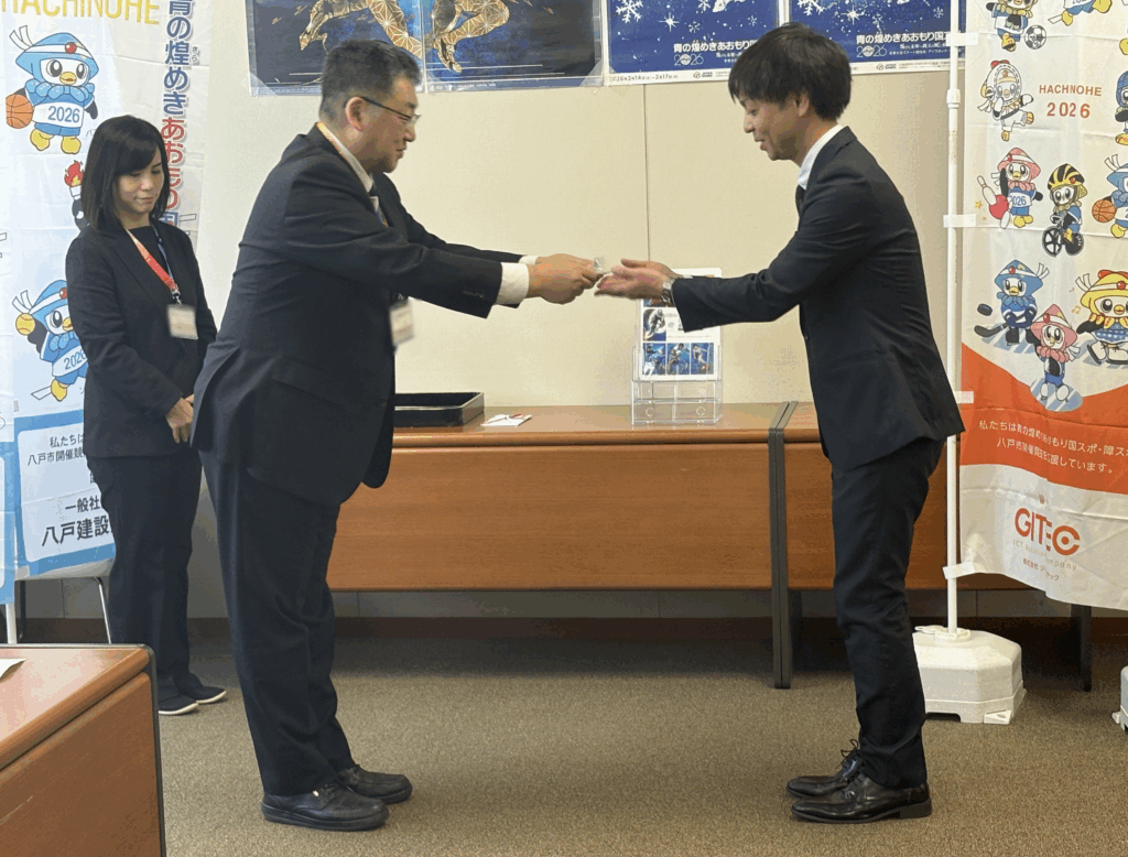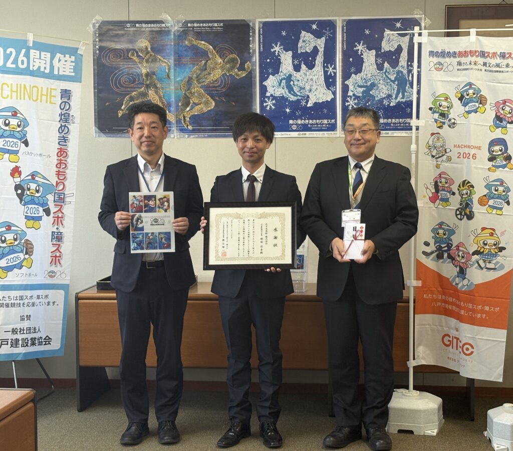 「青の煌めきあおもり国スポ」の開催にあたり、北日本造船株式会社様より国スポPR用クリアファイル400枚の御協賛をいただき、11月27日に感謝状贈呈式を行いました