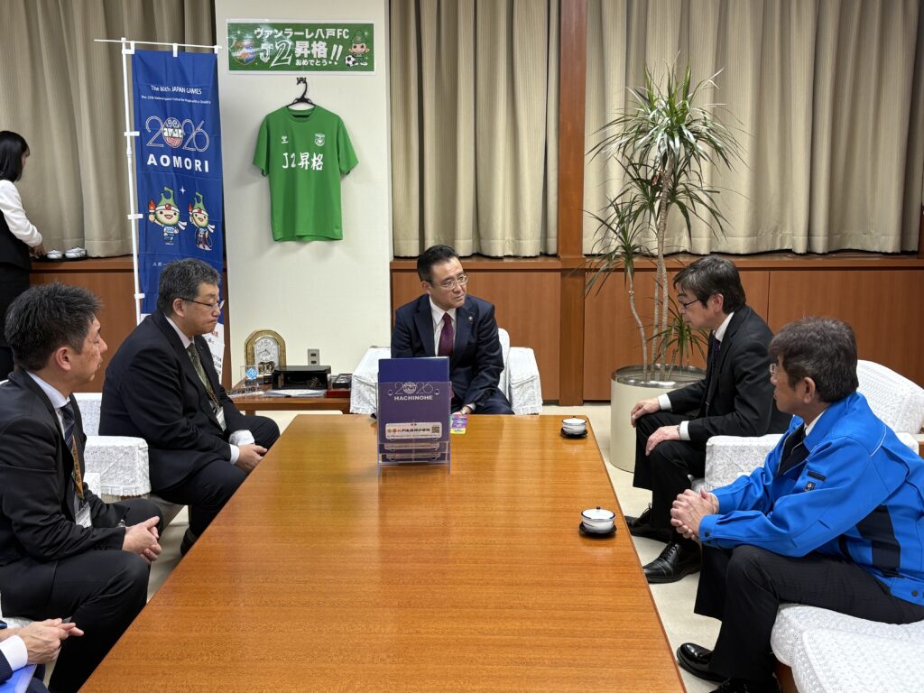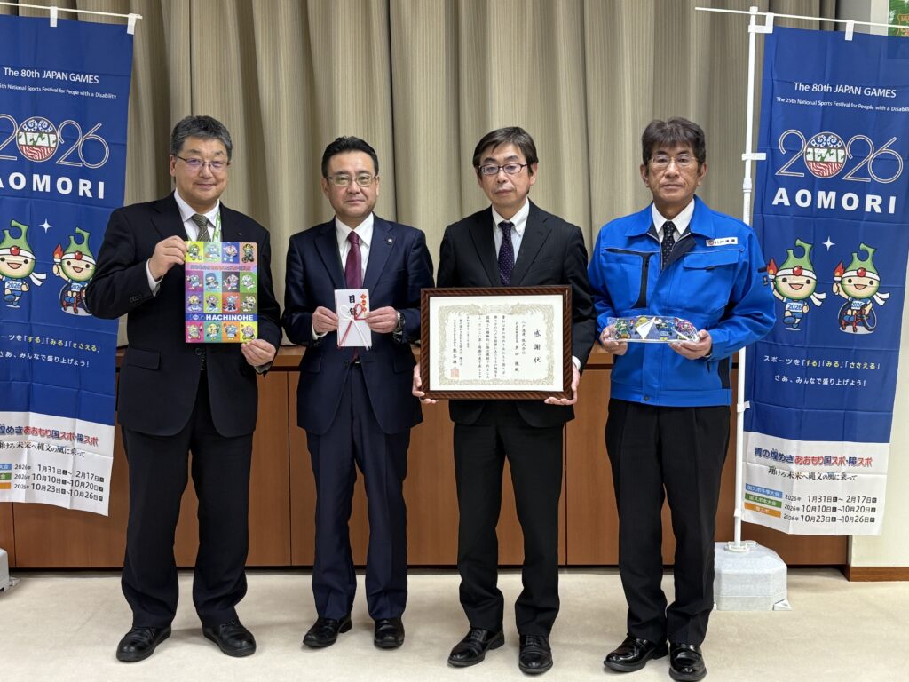 「青の煌めきあおもり国スポ」の開催にあたり、八戸通運株式会社様より国スポPR用クリアファイル1,500枚の御協賛をいただき、11月27日に感謝状贈呈式を行いました
