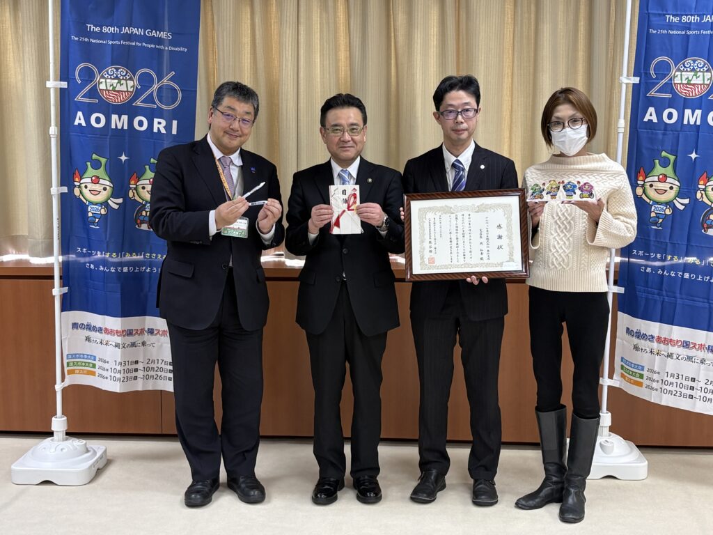 「青の煌めきあおもり国スポ・障スポ」の開催にあたり、テルウェル東日本株式会社東北支店様より刻スポ・障スポPRボールペン3,000本の御協賛をいただき、2月25日に感謝状贈呈式を行いました